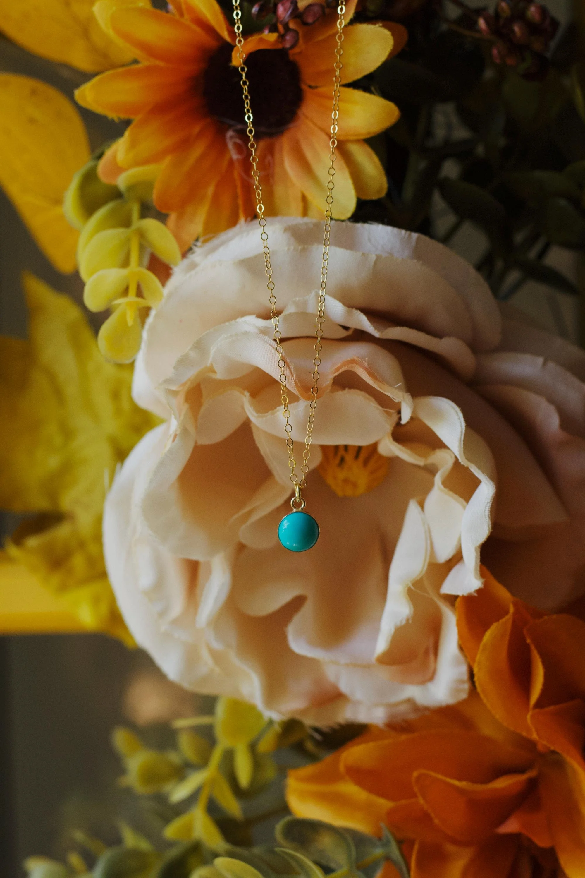 This elegant 14/20K gold-filled necklace features a genuine cabochon of vibrant, natural Mexican Turquoise set in a simple, high-polish bezel. The stone is a striking blue-teal hue, known for its clean, vivid color that creates a beautiful focal point.