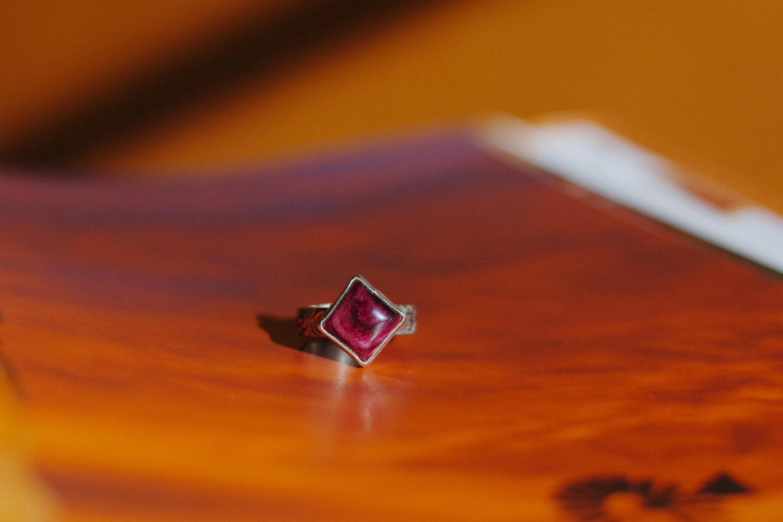 • Size: 6.5 • Stone: Purple spiny oyster • Metal: Solid sterling silver (.925) • Band: Hand-stamped with western detailing • Design: Diamond-set stone for a bold, unique look • Finish: Rustic polished finish • Handmade: Completely handcrafted