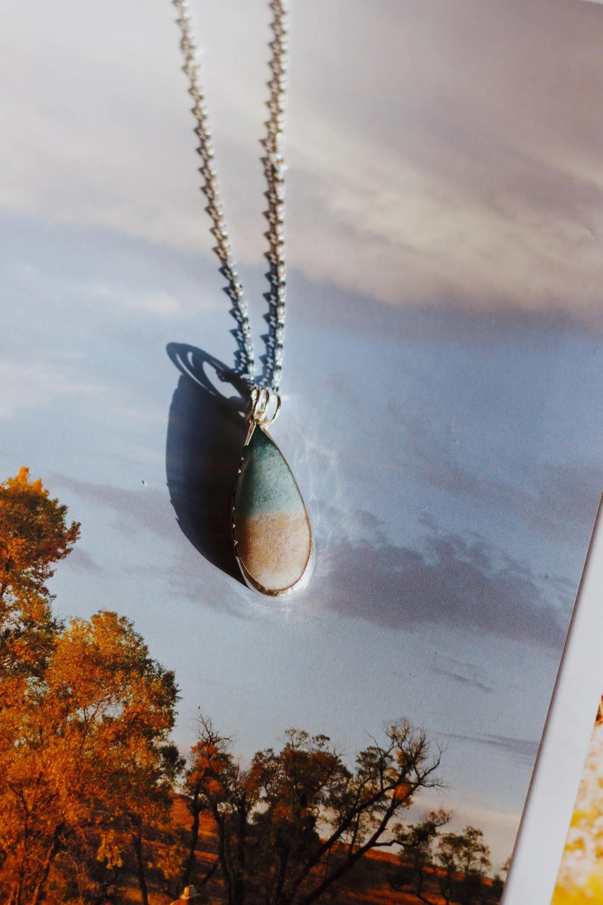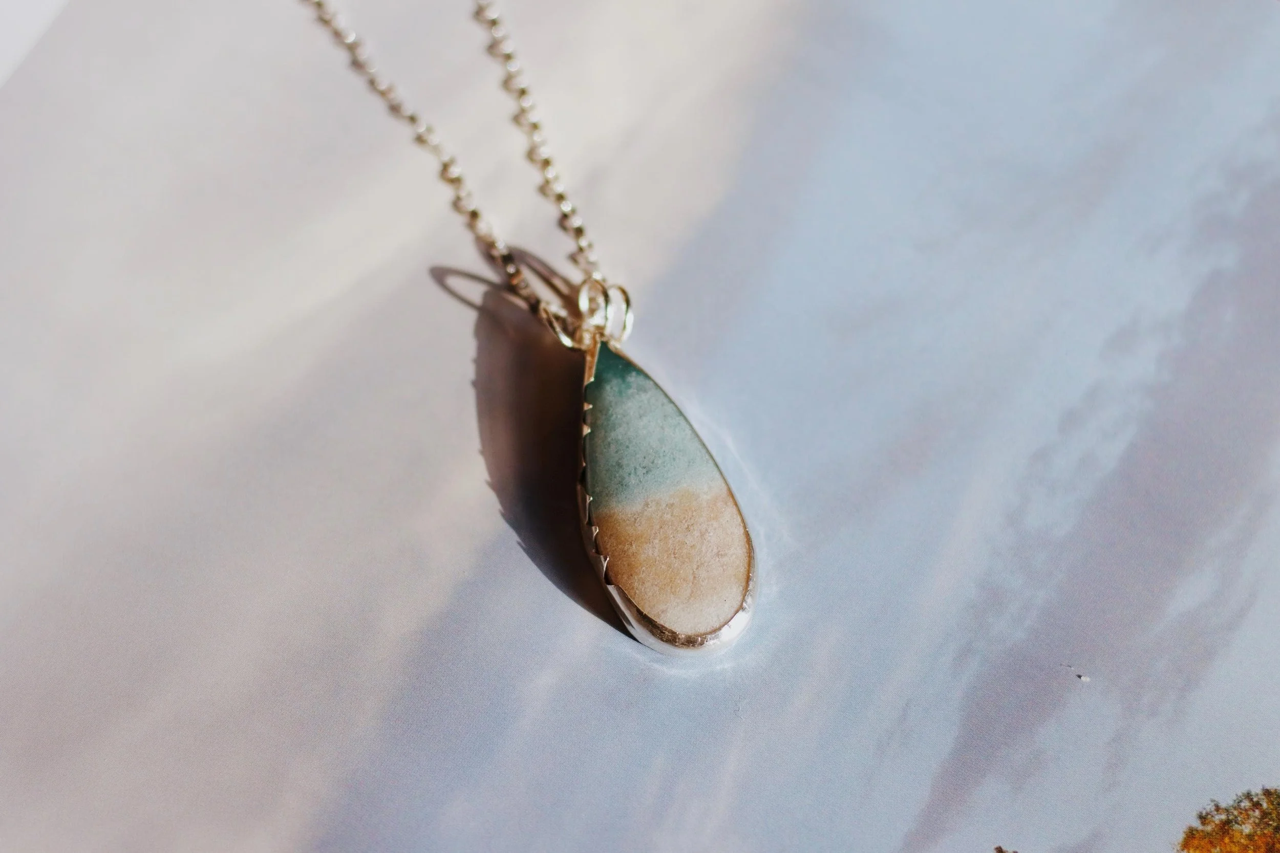 This handcrafted piece features trollite in quartz, a stone known for its dreamy blend of oceanic blues, sandy neutrals, and soft natural gradients. The stone is set in a unique shark bite bezel, giving the pendant a rugged, adventurous look that feels straight out of deep-water territory.