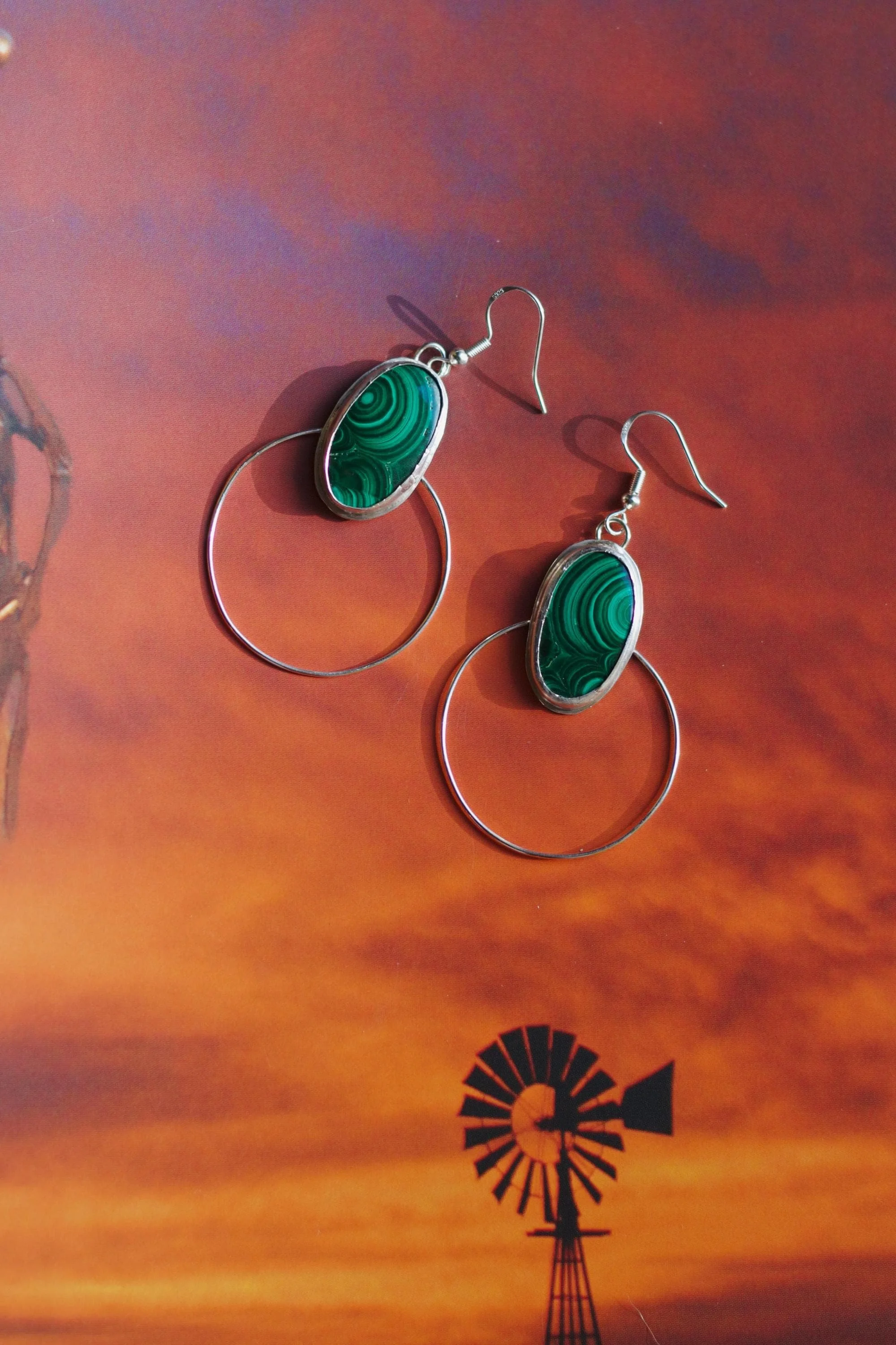 These earrings feature polished malachite ovals set in hand-fabricated sterling silver bezels. Beneath each stone hangs a sleek silver hoop, giving the pair a dramatic shape without feeling heavy.