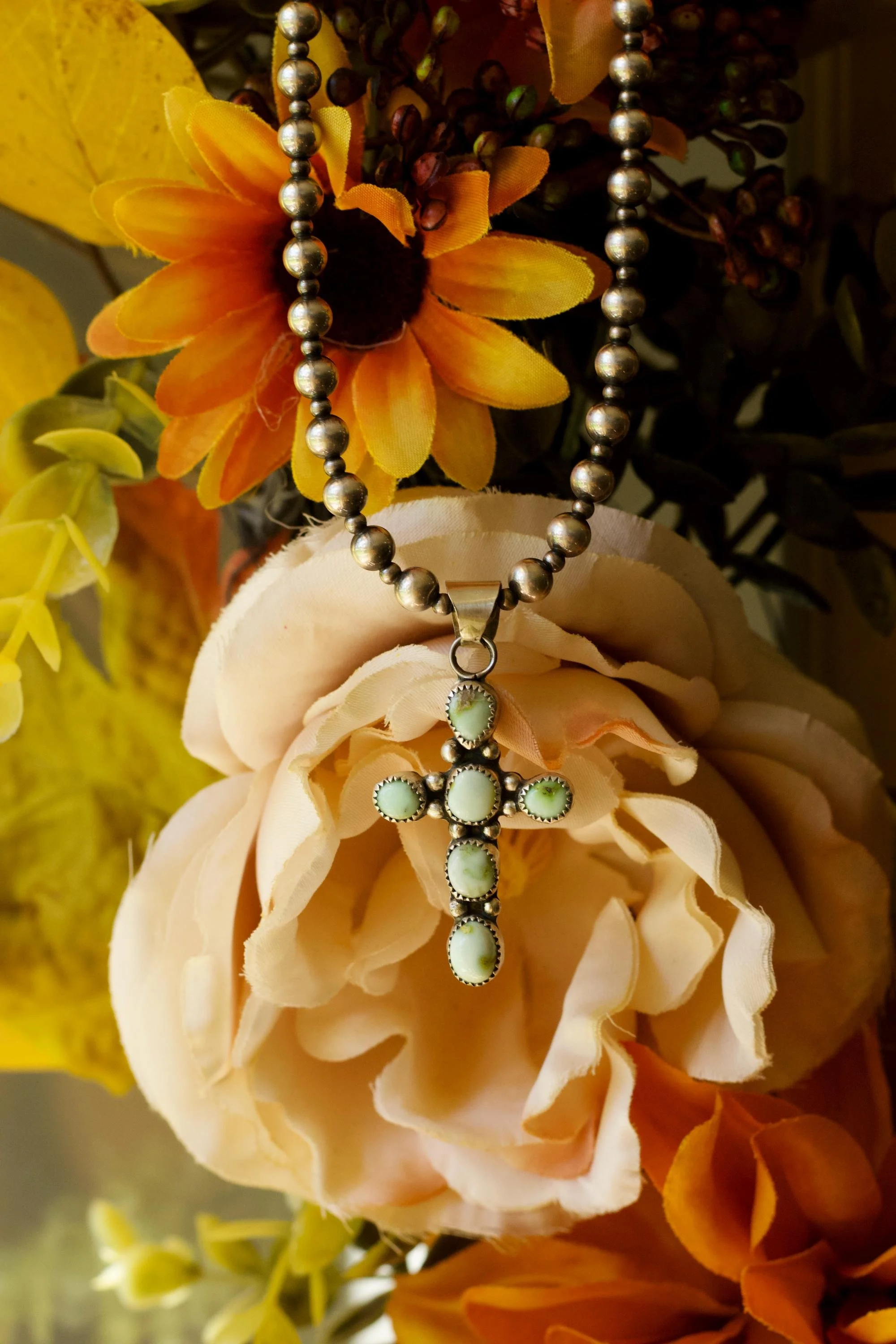 • Stone: Palomino variscite • Metal: Solid sterling silver (.925) • Style: Hand-fabricated silver cross pendant • Chain: Not included • Design: Five variscite stones arranged in a classic cross layout, rope bezel + silver drop accents • Finish: Lightly oxidized + polished for a vintage western look • Handmade: Built, soldered, set, and finished by hand