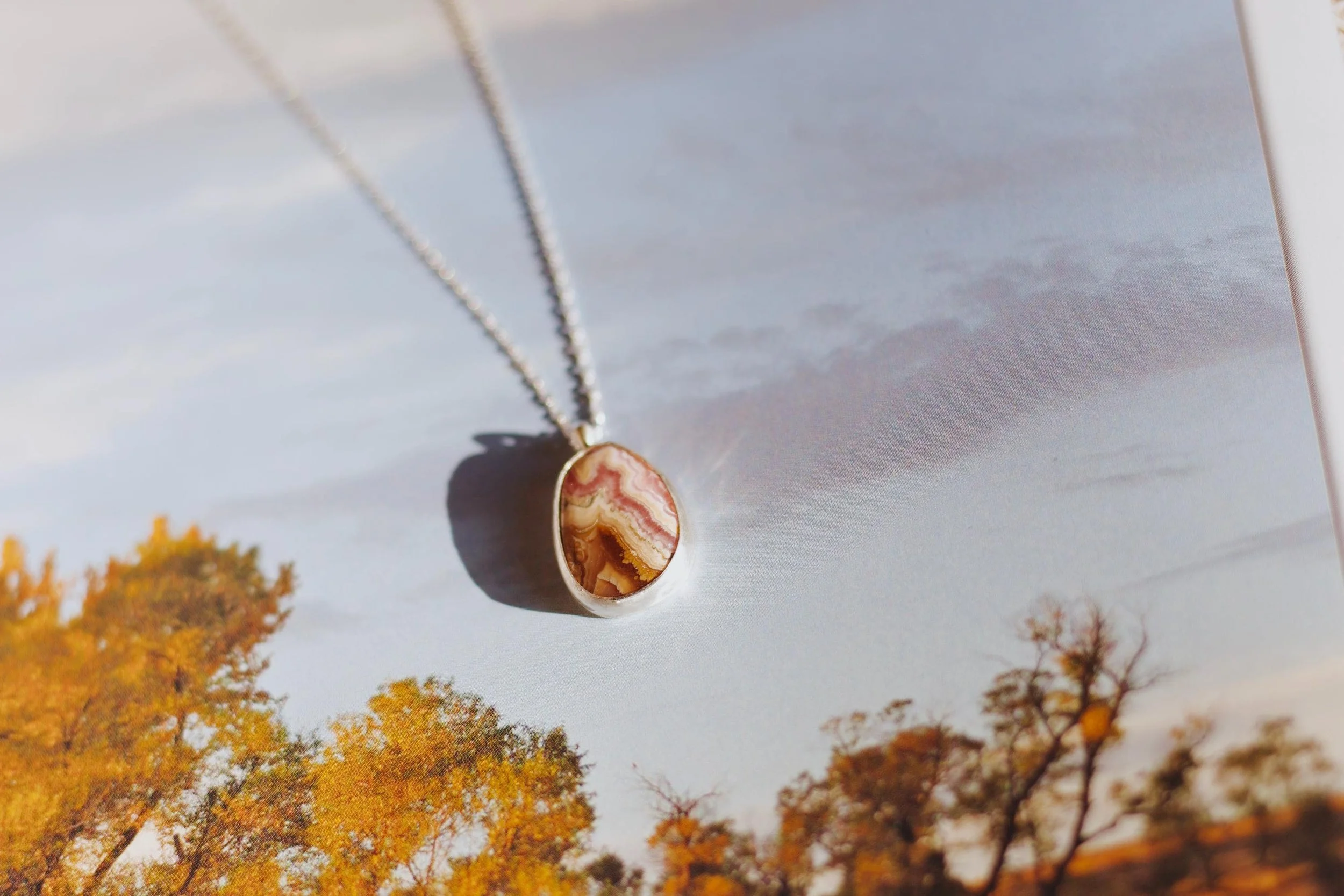 Say hello to Posie — a soft, warm, and naturally romantic pendant handcrafted in sterling silver. This necklace features a beautiful rhodochrosite stone with swirling shades of blush pink, rose, and earthy neutrals. Its natural banding gives each piece a truly one-of-a-kind personality.