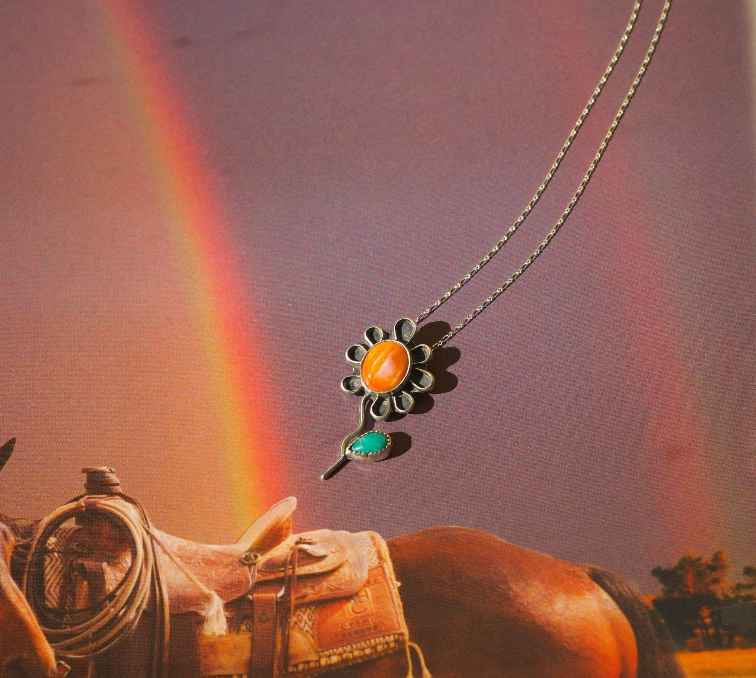 Handcrafted with a touch of sunshine and a little wild spirit — The Junie necklace is a one-of-a-kind sterling silver necklace featuring warm orange spiny oyster and bright turquoise. Each petal and stem was hand-fabricated with care, creating a design that feels both free-spirited and timeless.