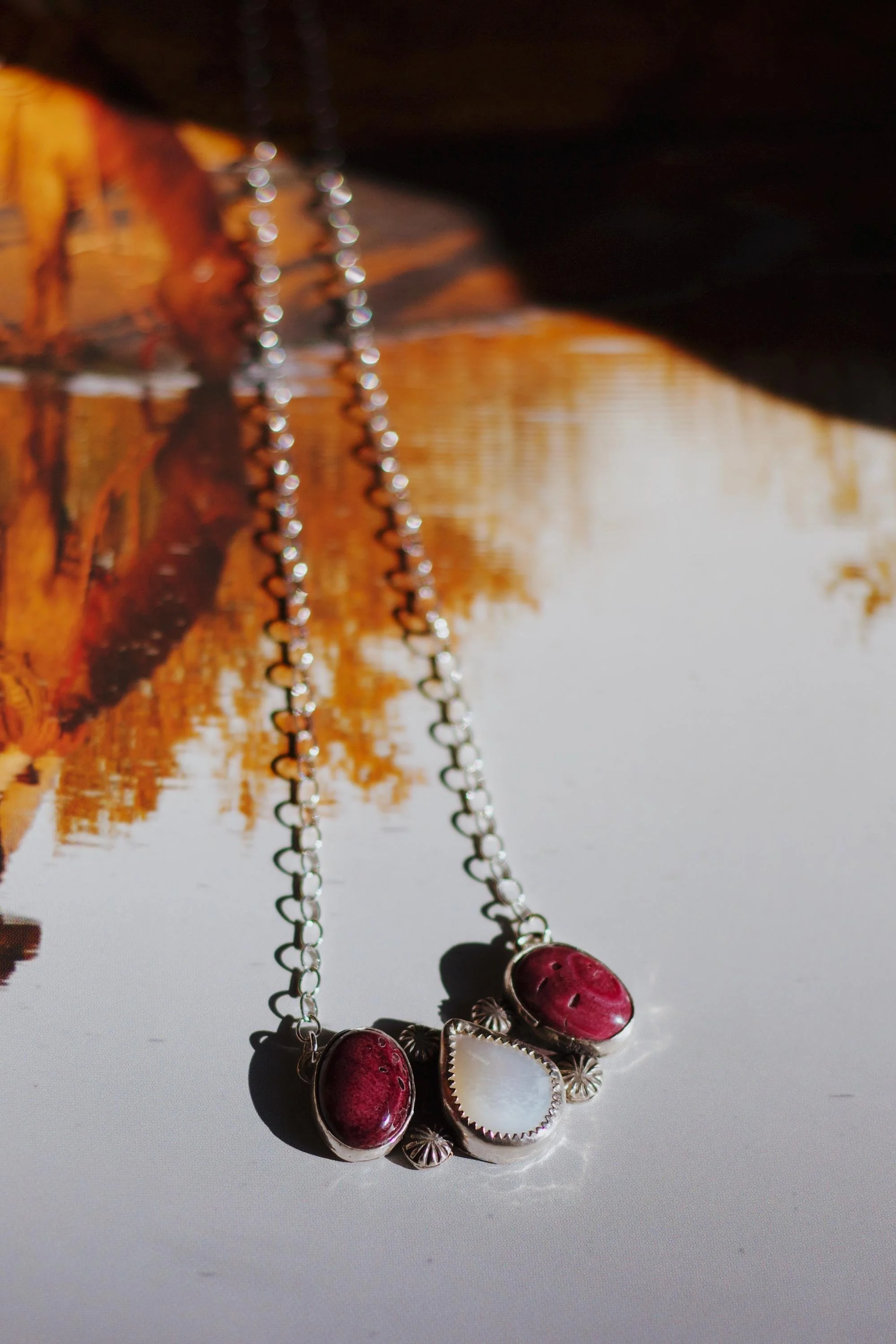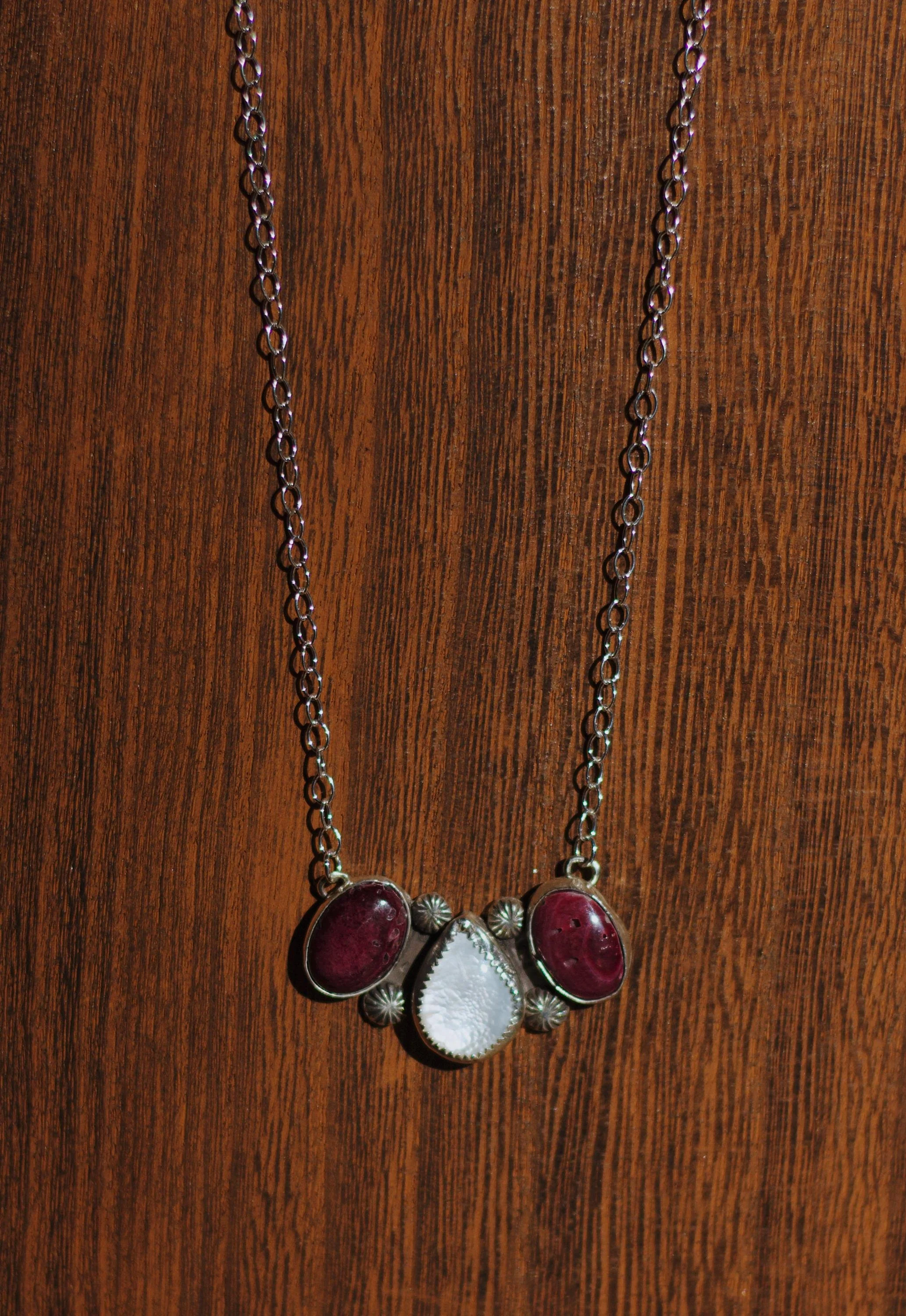 This handcrafted necklace features two deep purple spiny oyster stones framing a luminous mother of pearl teardrop centerpiece. The trio is accented with stamped sterling silver starbursts and beaded detailing that give the piece a soft, vintage-inspired feel.